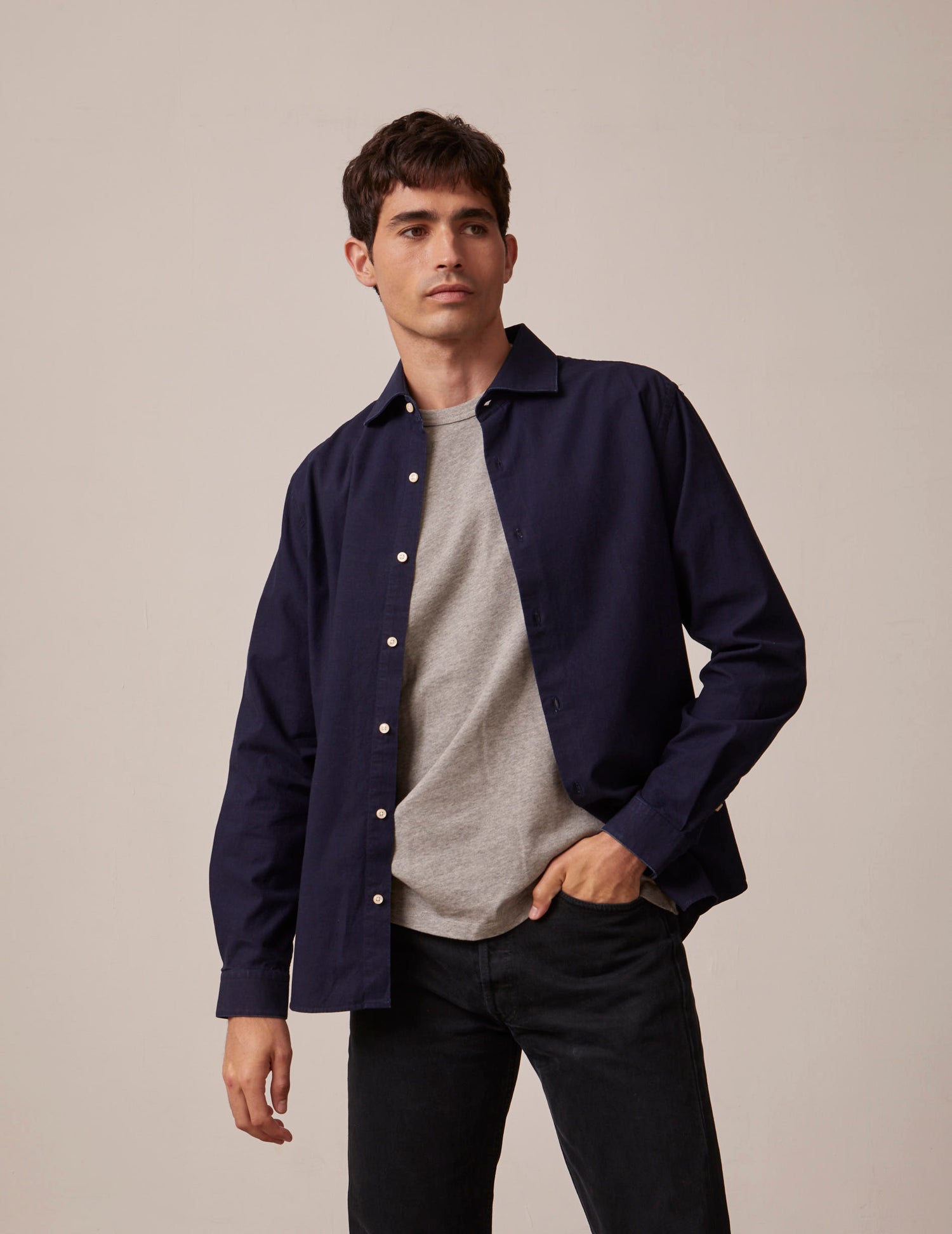 Notre chemise signature à col droit ouvert, déclinée dans plusieurs coloris et matières.