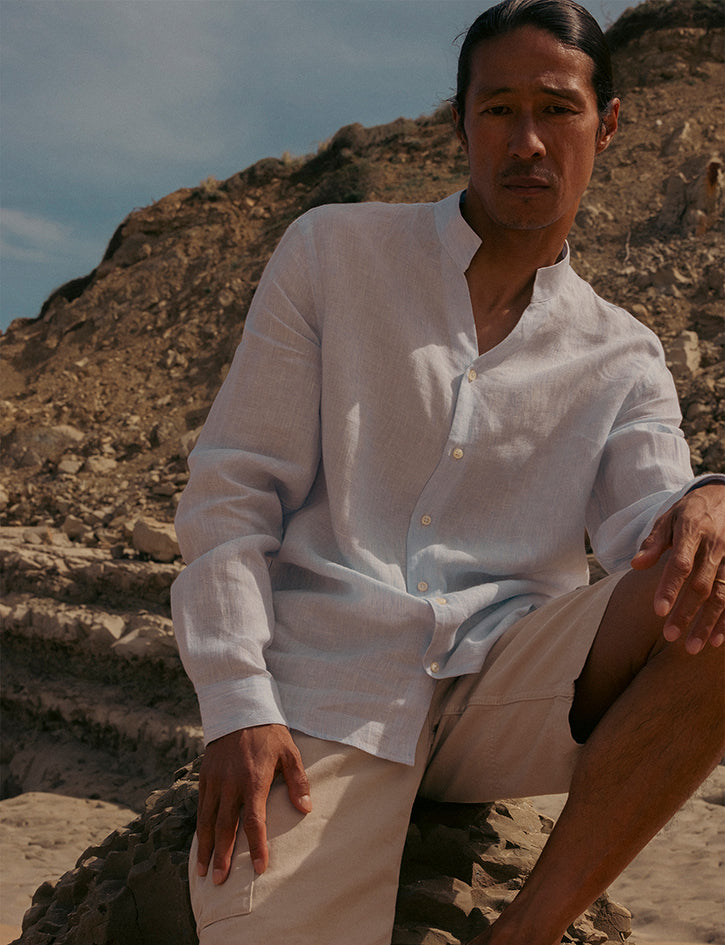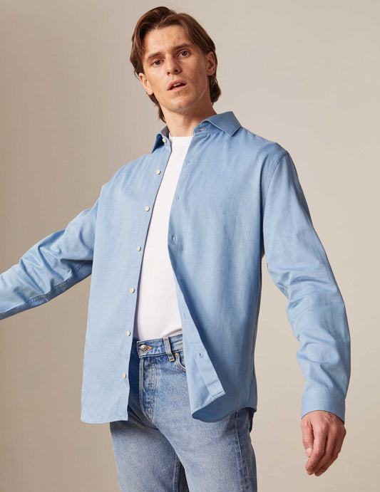 Our signature shirt with an open straight collar, available in various colors and fabrics.