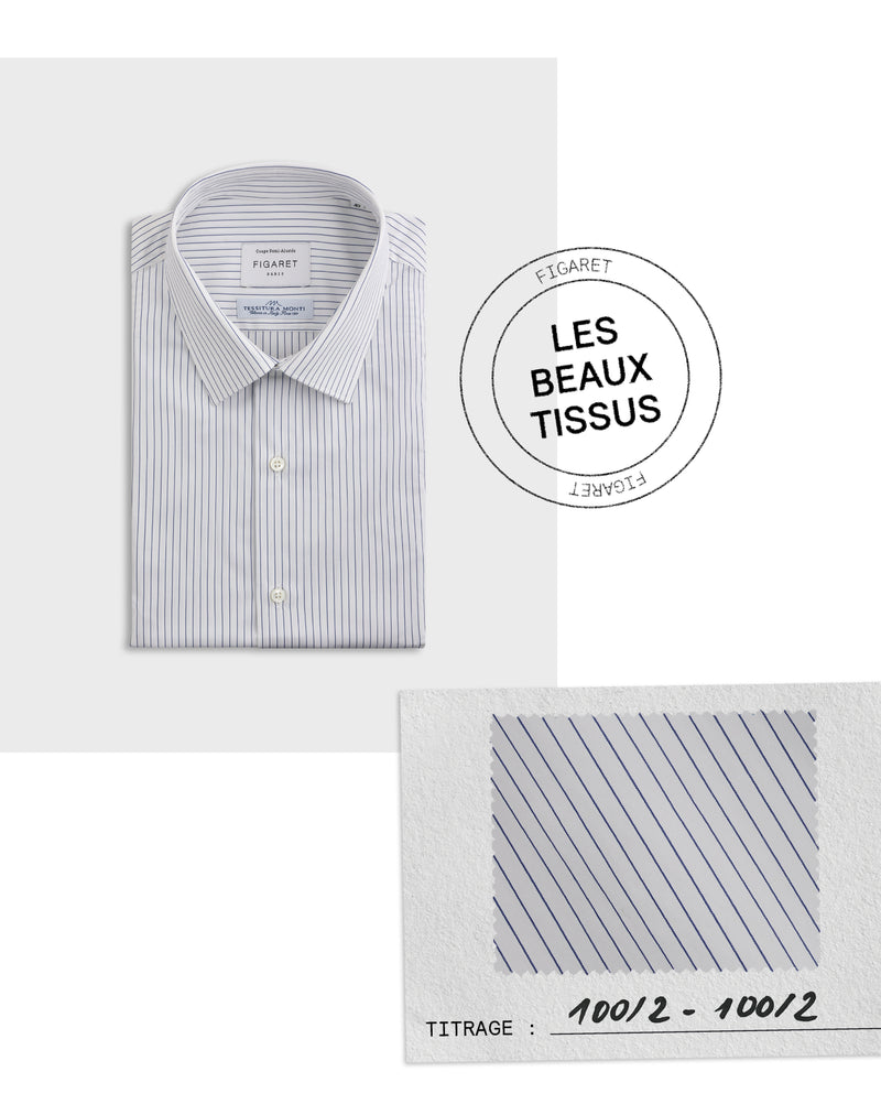 The Italian house Tessitura Monti, established in 1911, provides fabrics of unparalleled finesse and texture, specifically chosen for shirtmaking.