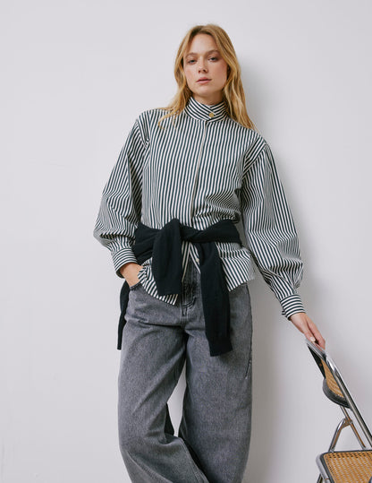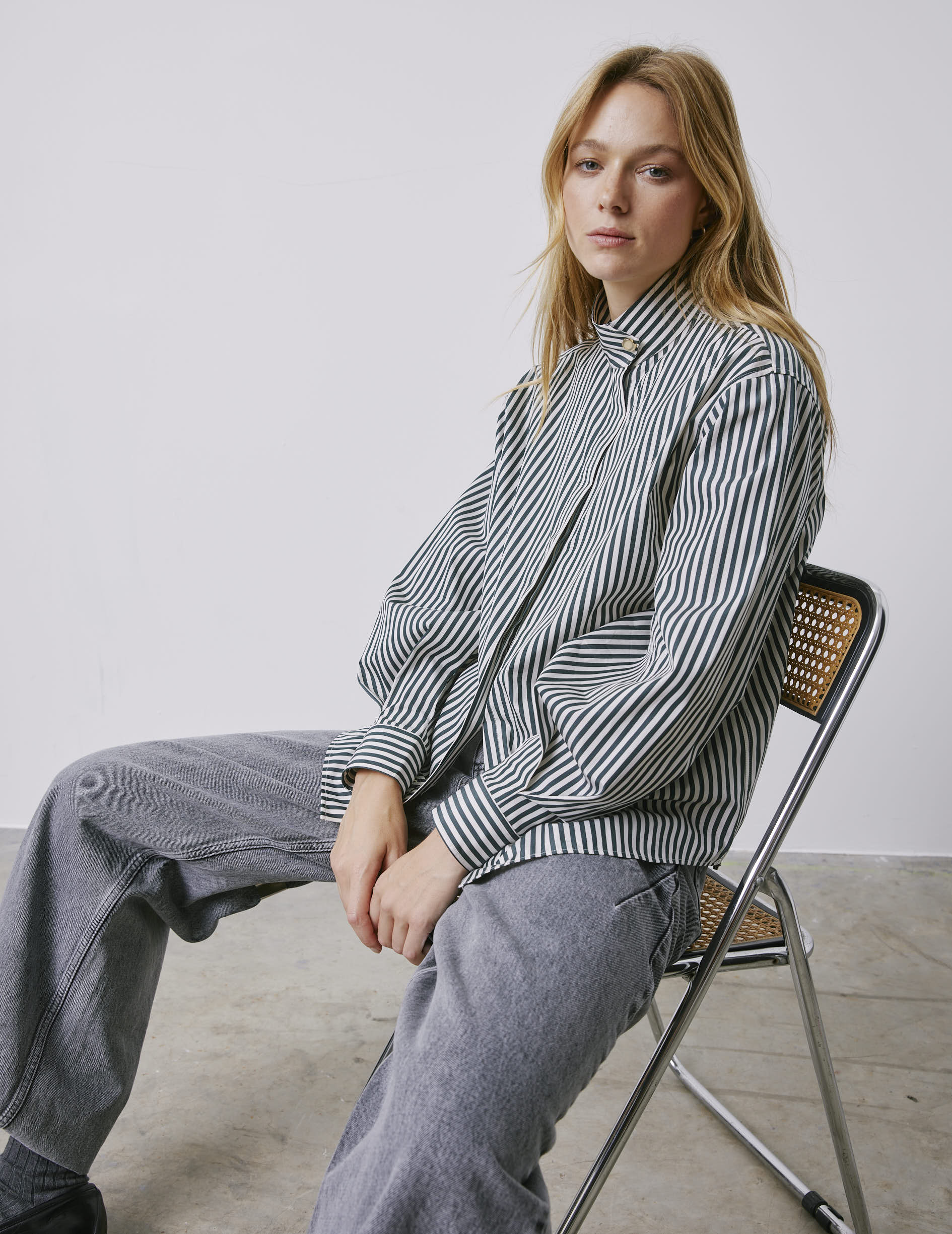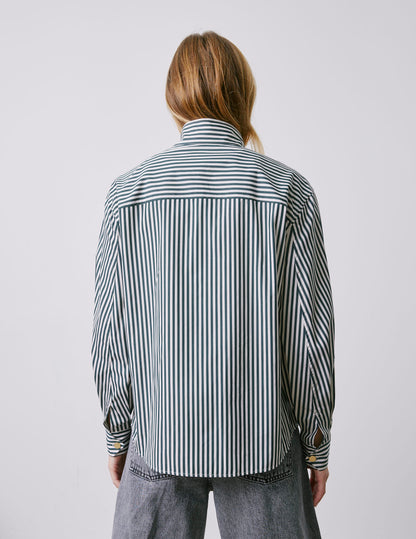 Innaée green striped hidden button placket shirt Poplin - High Collar