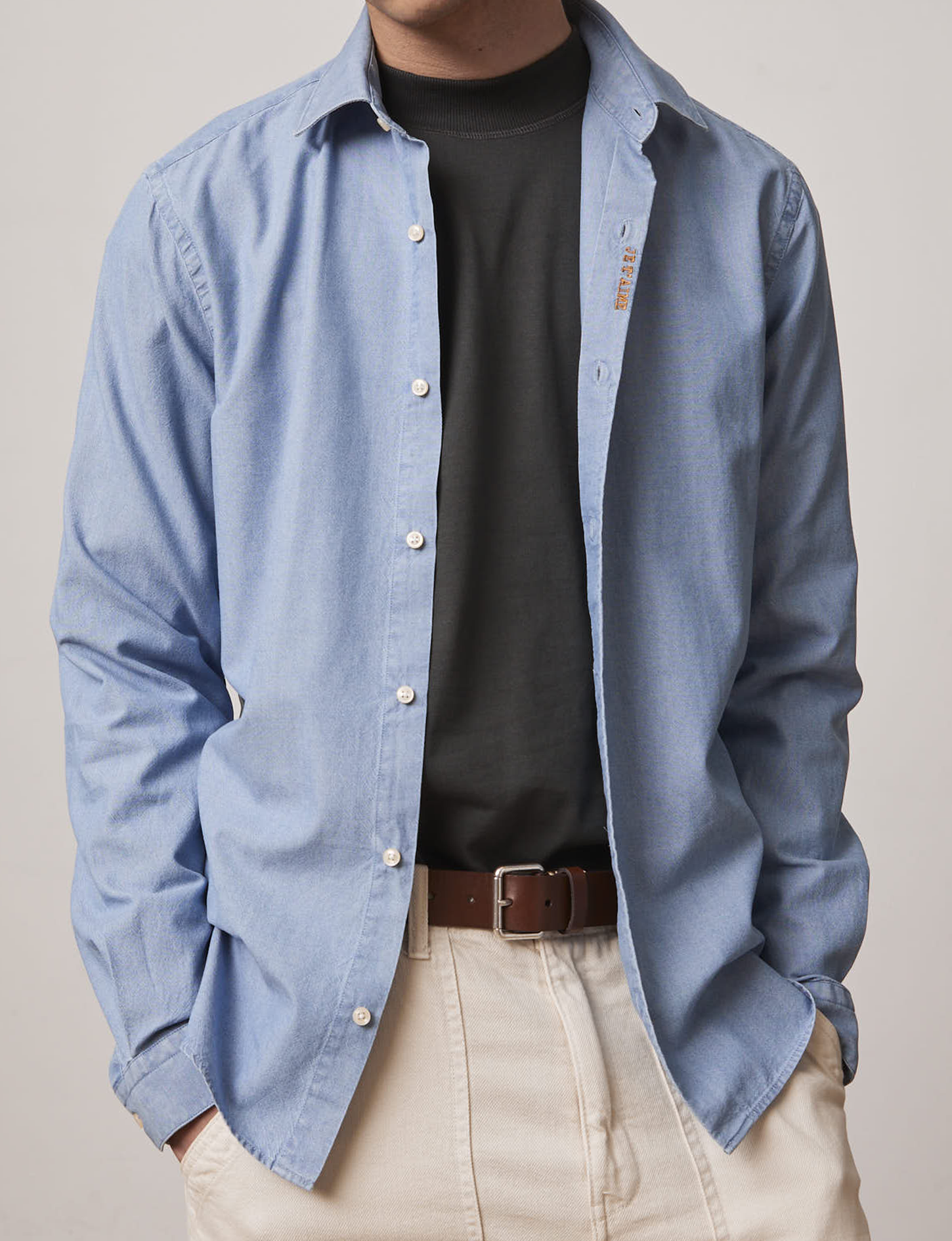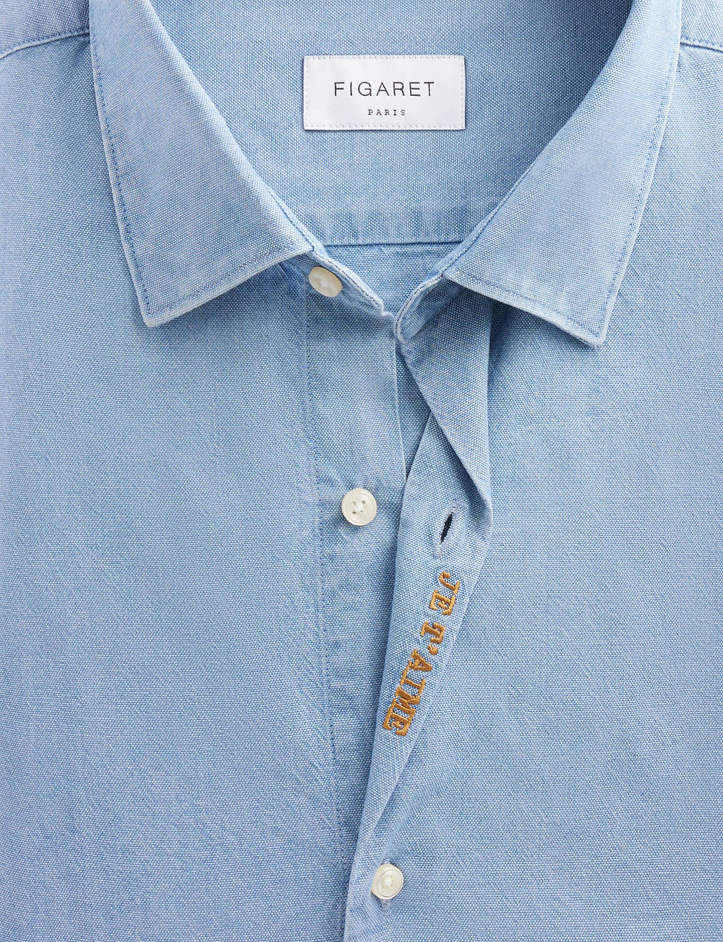 blue "Je t'aime” unisex shirt with camel embroidery Chambray - Figaret Collar