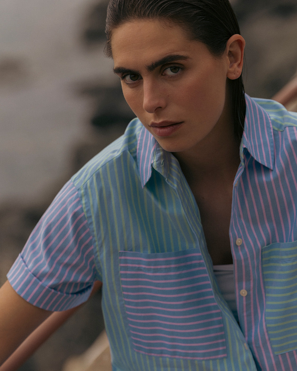Un ensemble en seersucker rayé, une chemisette marine subtilement ajourée ou encore le polo Lilian en maille fine — autant de pièces à la fois légères et structurées pour arpenter les ruelles escarpées de la ville.