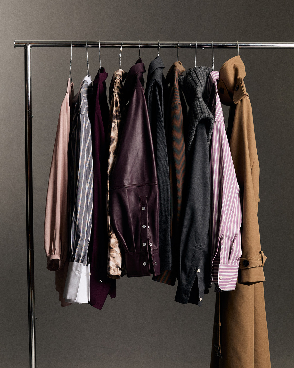À ces nouvelles interprétations de la chemise Figaret s’ajoutent des pièces de prêt-à-porter, imaginées pour composer un vestiaire complet : un trench en gabardine de coton italien coloris tabac, un ensemble gilet et pantalon en laine vierge grise, des cols roulés “chaussette” ou plastron généreux, parfaits pour les jeux de superpositions.