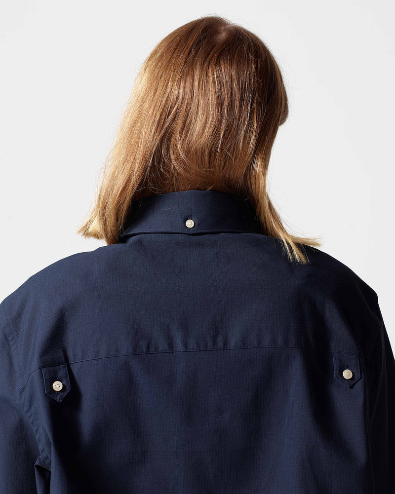 Confectionnée en tissu ripstop bleu marine, rappelant les uniformes de l'armée de l'air, elle intègre des détails évoquant la toile de parachute. Dotée de poches poitrine à rabat boutonnées, d'une poche à ouverture latérale - idéale pour y glisser un plan de vol -, et d’un col prodigieux maintenu par des boutons, elle offre une grande versatilité.