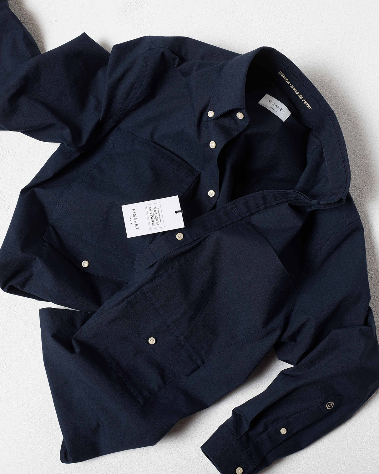 De coupe mixte, cette chemise en popeline blanche dévoile sa broderie marine à l’intérieur de la patte de boutonnage — inscrivant ainsi quelques notes de poésie au plus près du cœur…
