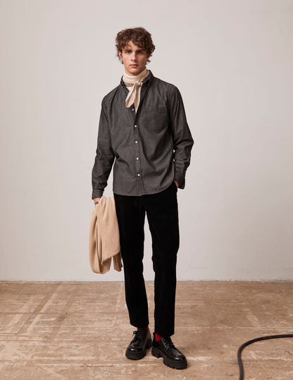 - Col américain : col boutonné casual-chic. Les boutons qui retiennent les pointes font la particularité de ce col. À porter fermé ou ouvert sur un t-shirt. Un essentiel pour une allure décontractée.