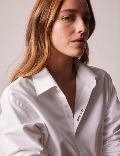 Chemise "Je t'aime" librement inspirée du film "les Choses de la vie" de Claude Sautet. La chemise mixte : c'est la chemise d'homme qui n'est jamais aussi bien portée que par une femme. Un message, une déclaration d'amour que l'on adresse à l'autre ou à soi-même : "Je t'aime" est subtilement brodé sur l'envers de la patte de boutonnage, non loin du cœur.