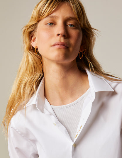 Chemise "Je t'aime" librement inspirée du film "les Choses de la vie" de Claude Sautet. La chemise mixte : c'est la chemise d'homme qui n'est jamais aussi bien portée que par une femme. Un message, une déclaration d'amour que l'on adresse à l'autre ou à soi-même : "Je t'aime" est subtilement brodé sur l'envers de la patte de boutonnage, non loin du cœur.