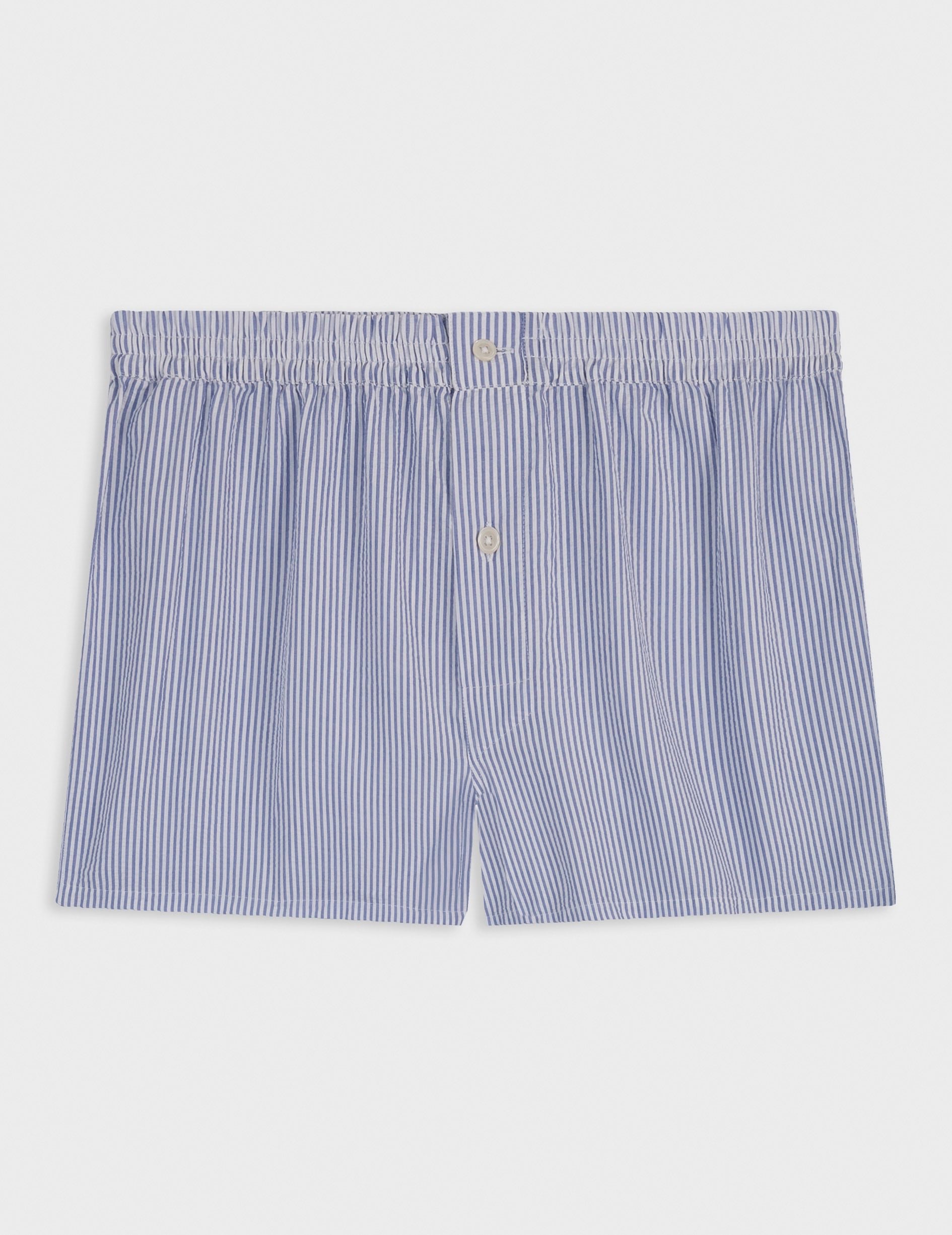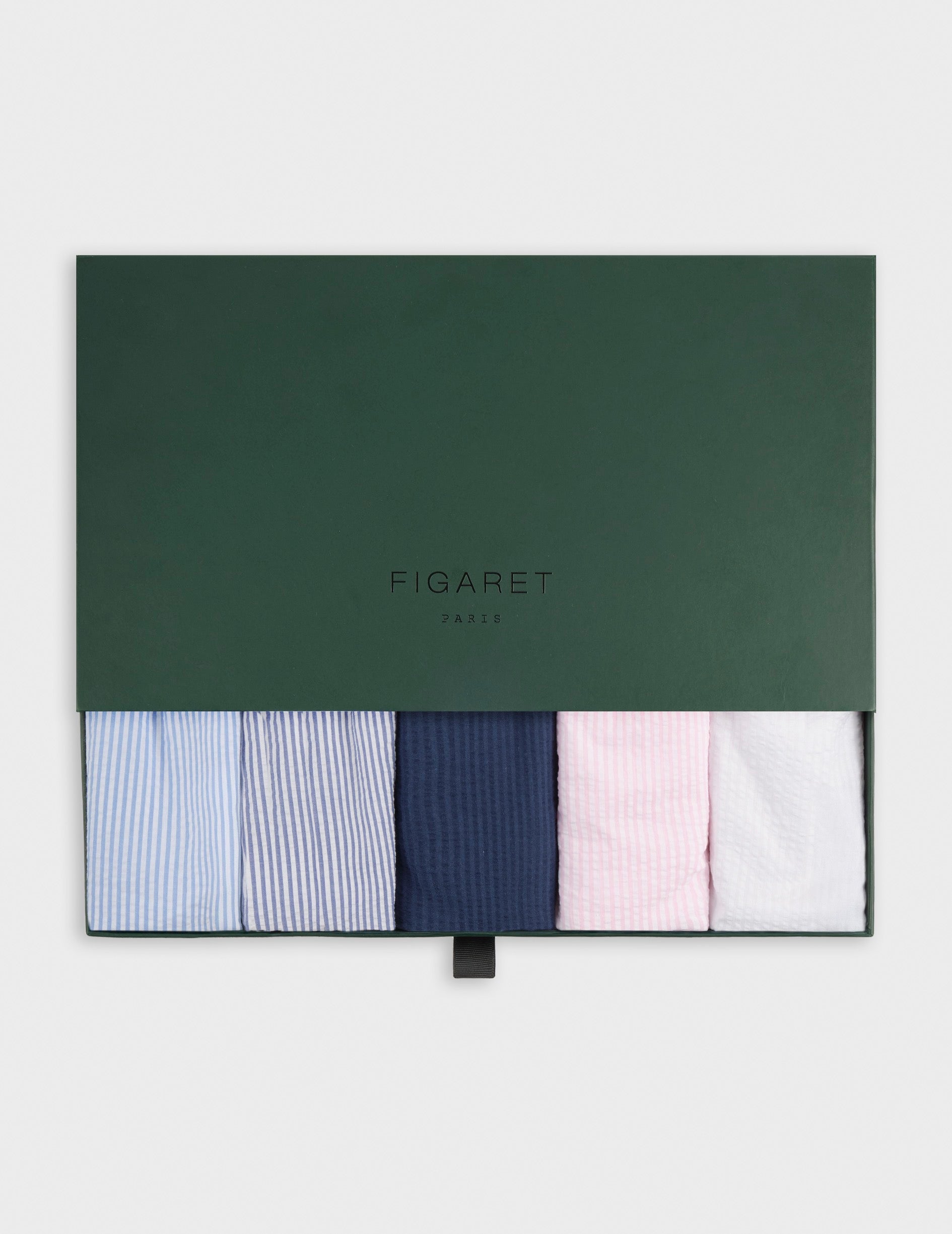 - Semainier composé de 5 caleçons en seersucker : rayé bleu, rayé marine, rayé marine ton sur ton, rayé rose clair, blanc